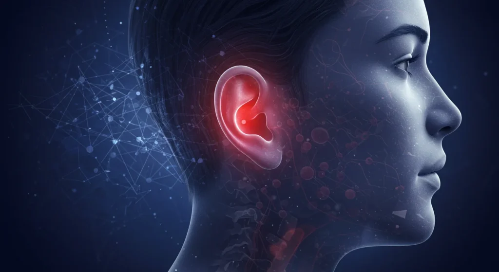 During energy healing, scorching sensations in the vicinity of the ear could be indicative of a hyperactive throat or third-eye chakra, associated with communication and perception. This may arise at times of stress, spiritual growth, or intense emotional processing.